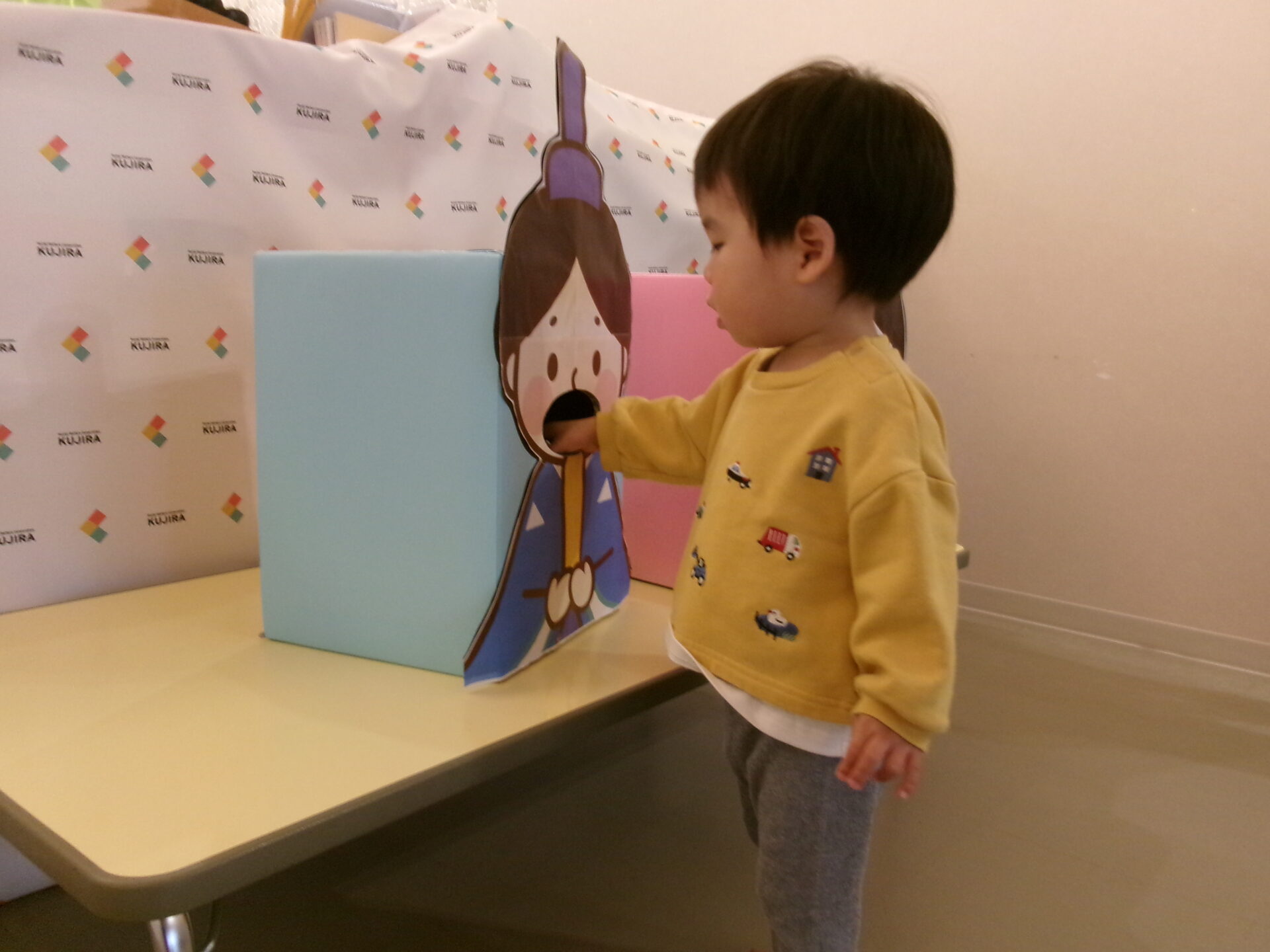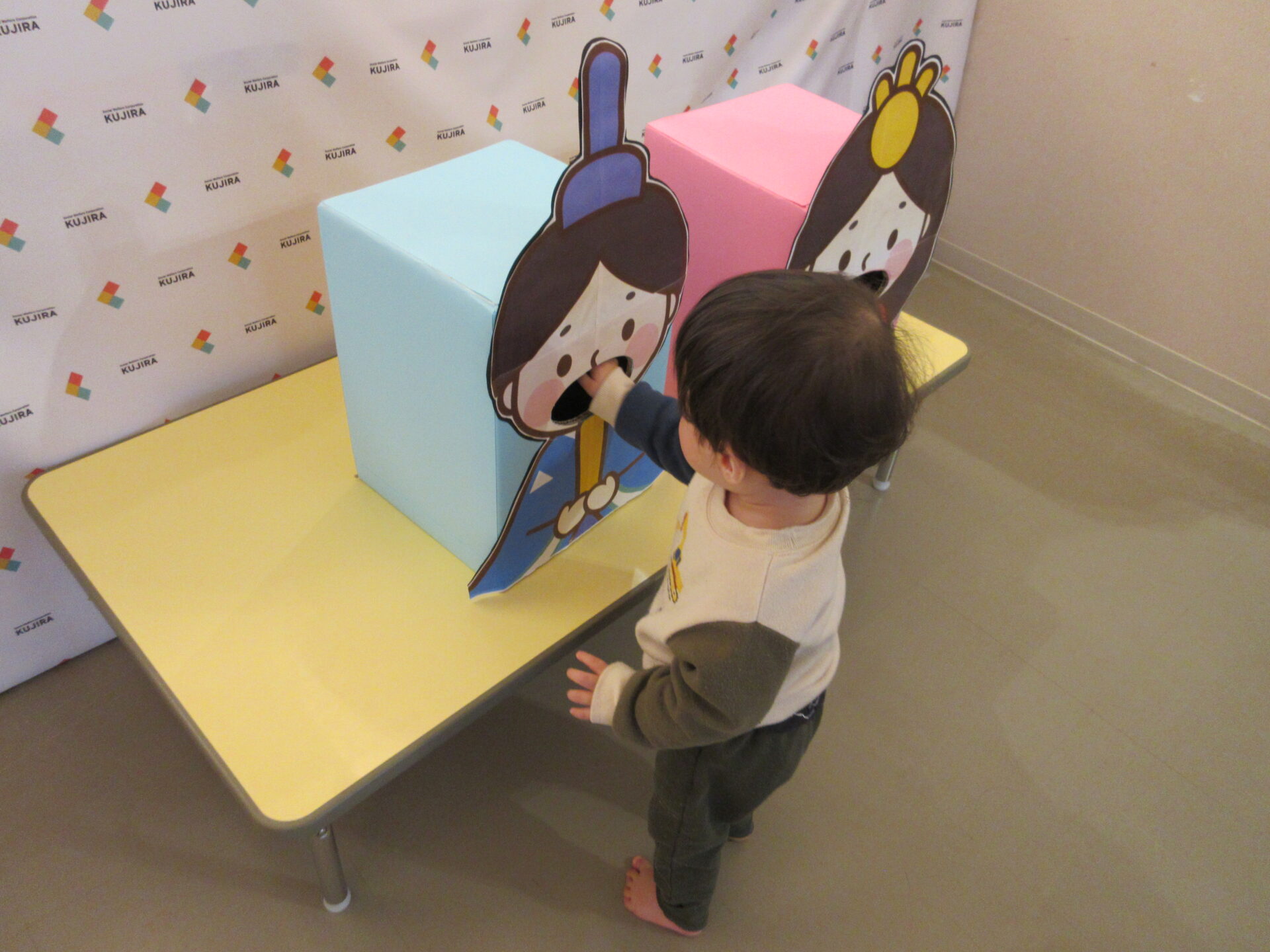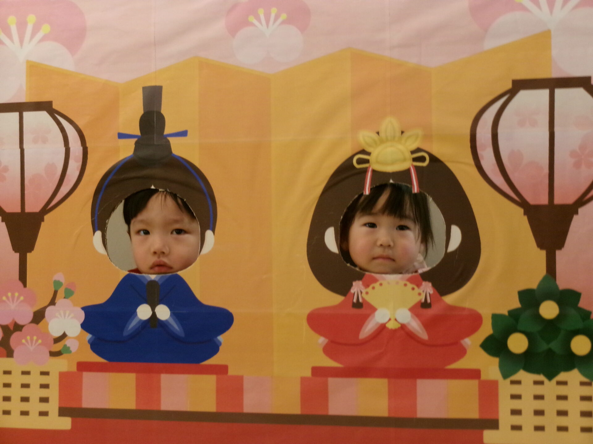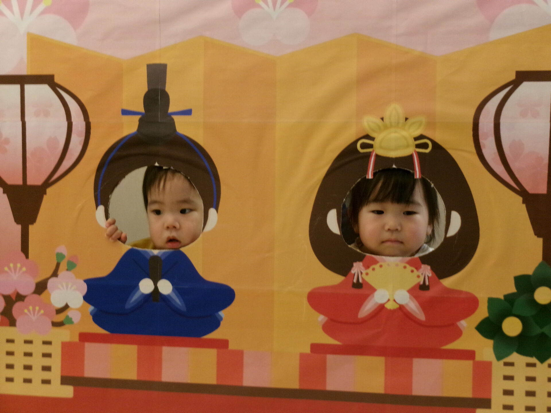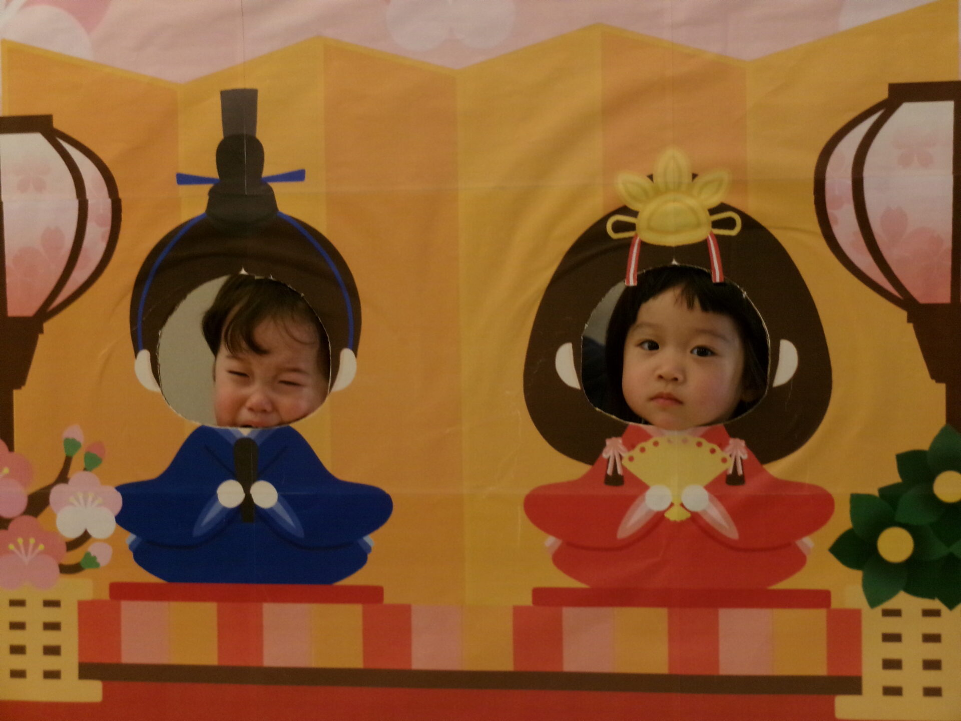 おひなさま💖 おだいりさま💙の顔出しパネルに変身でーす。「かわいい・カッコイイかしら?」