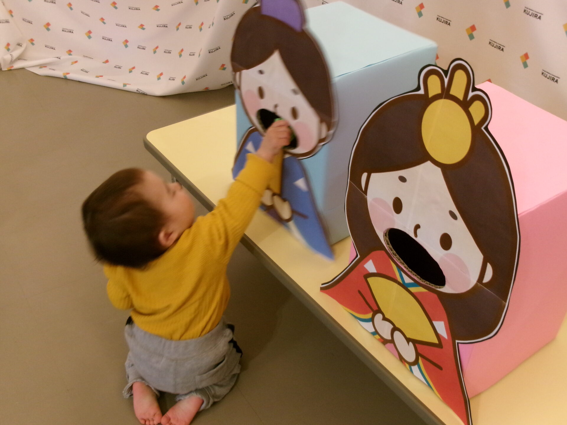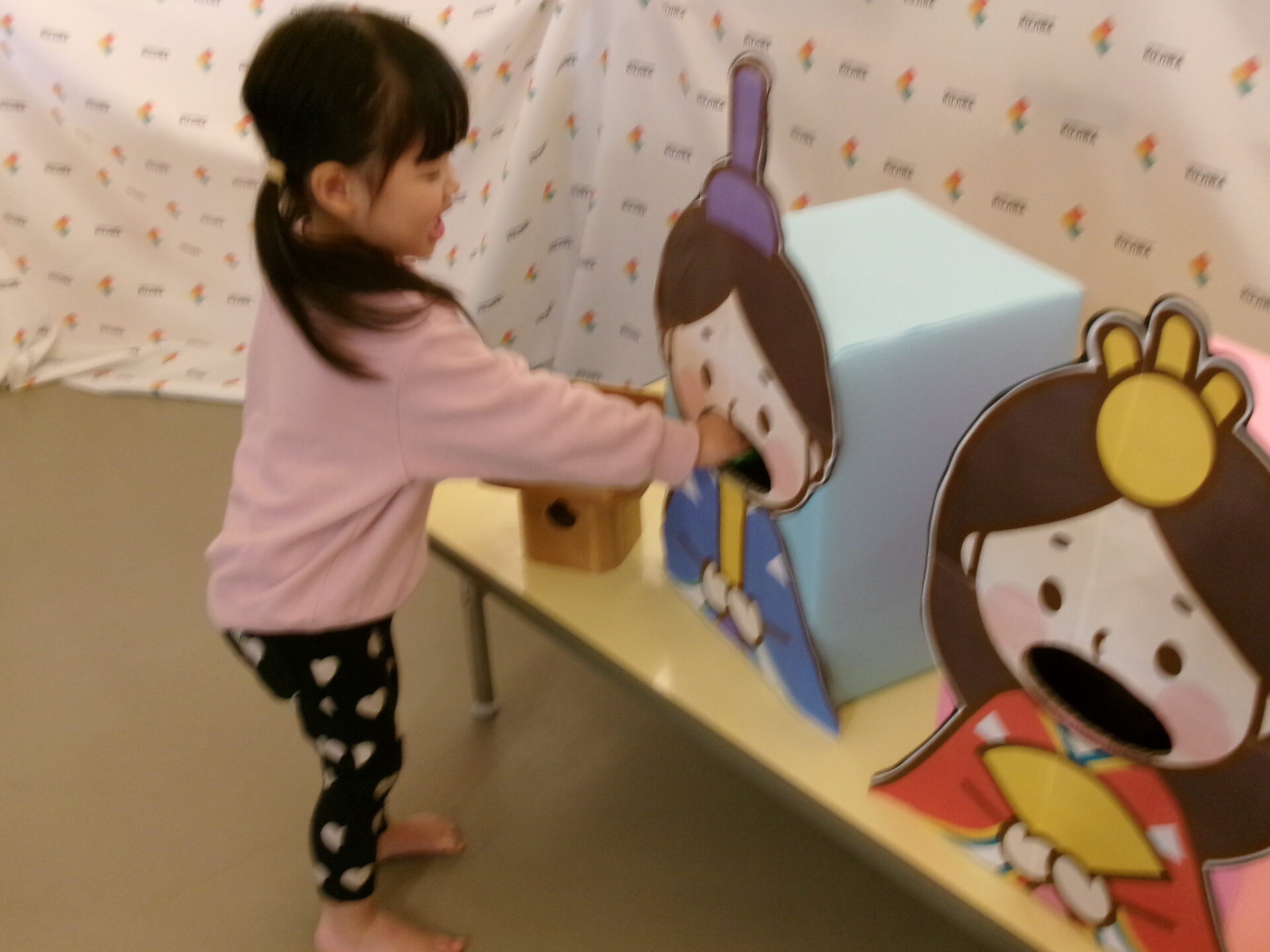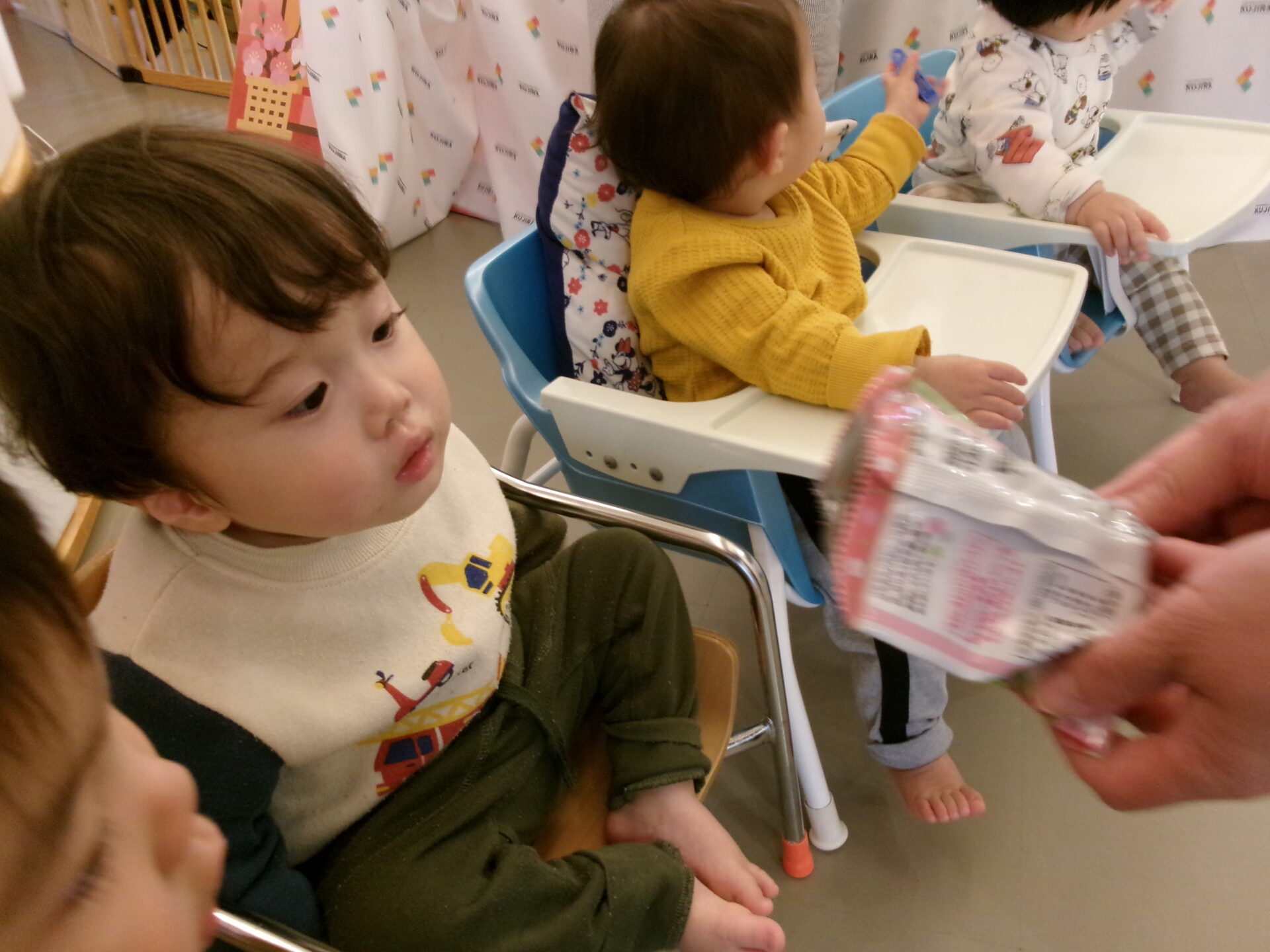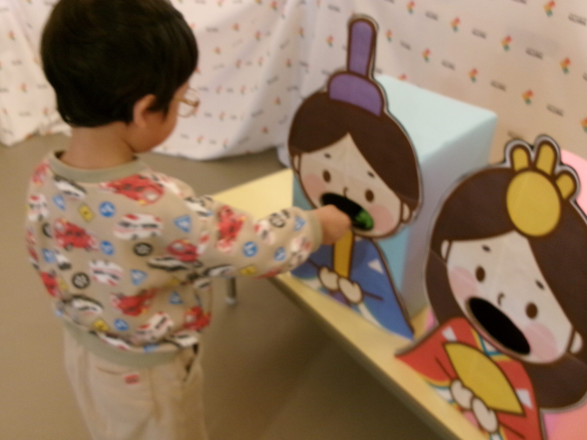 ひなあられ、運びゲームをしました。0歳児は自分でひなあられを取って、おひなさま・おだいりさまの口へ入れました。自分で歩いていけましたよ。
