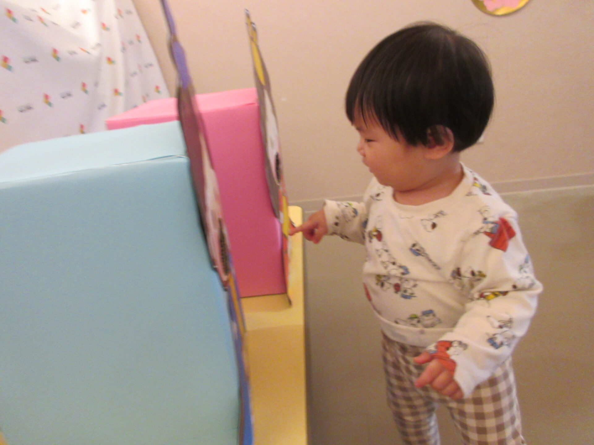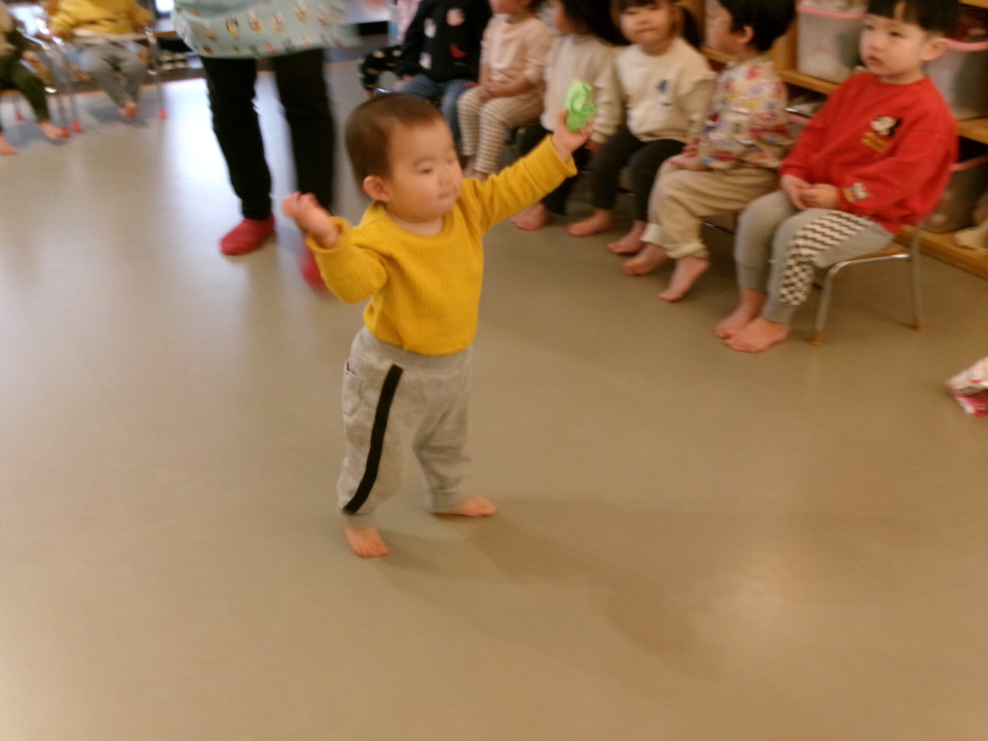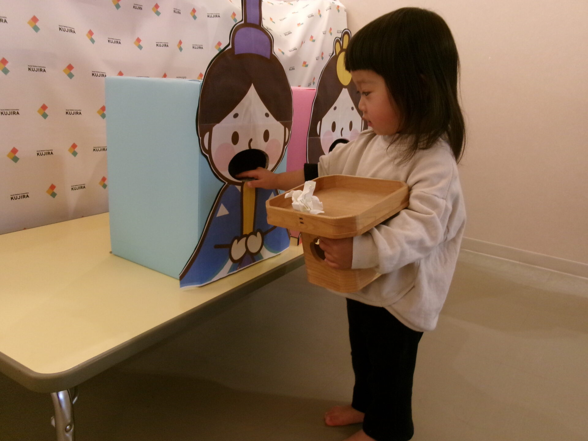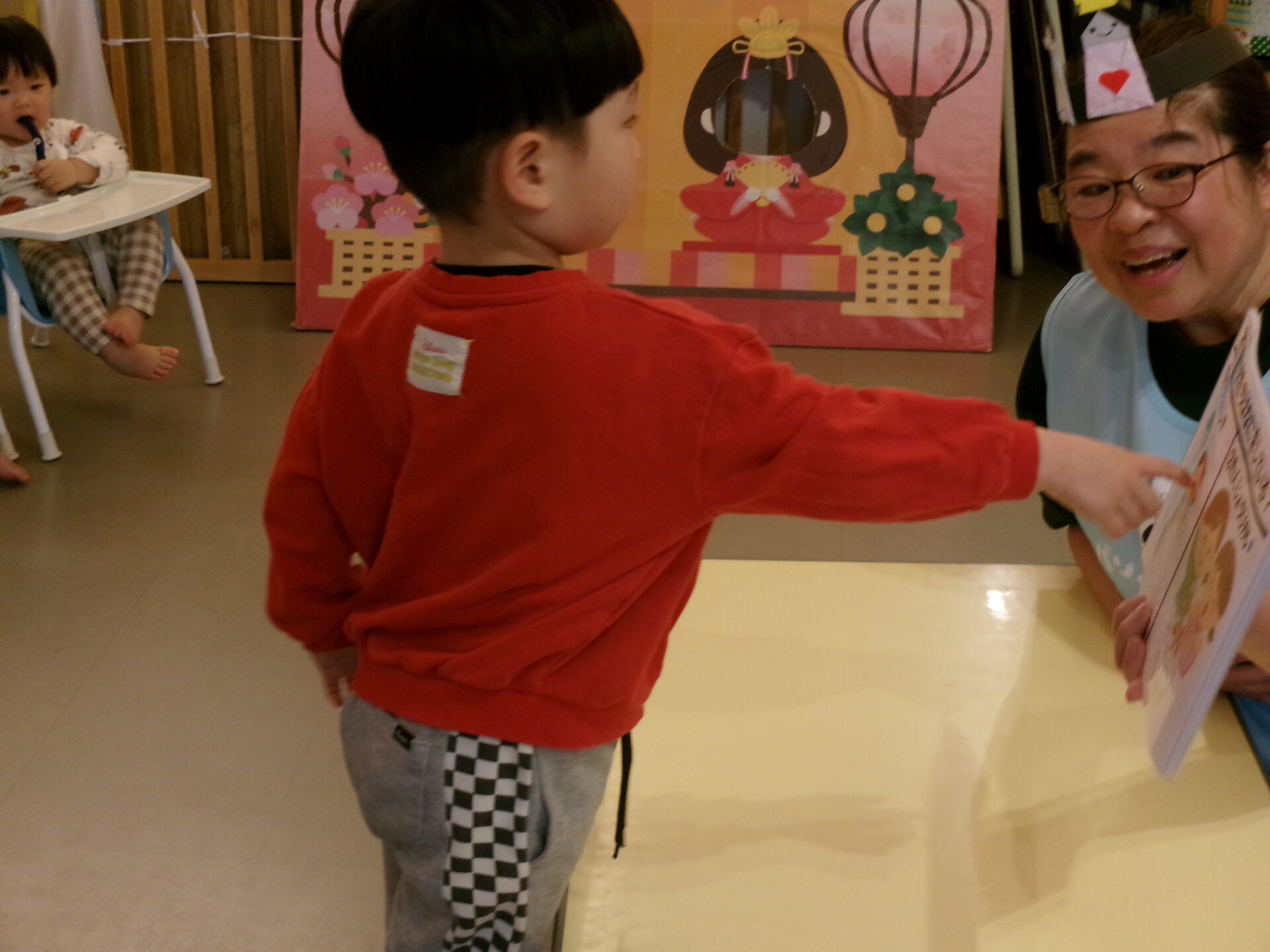 ひなあられ、運びゲームをしました。0歳児は自分でひなあられを取って、おひなさま・おだいりさまの口へ入れました。自分で歩いていけましたよ。