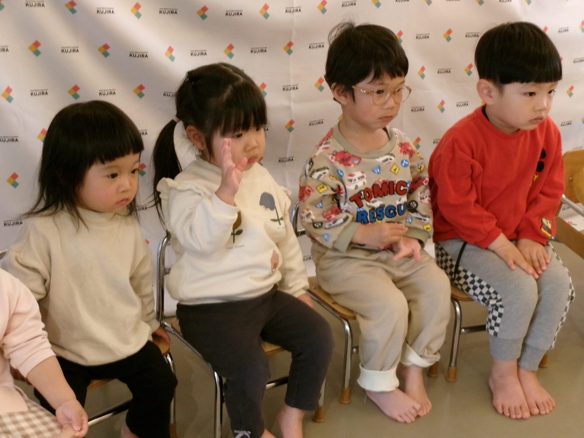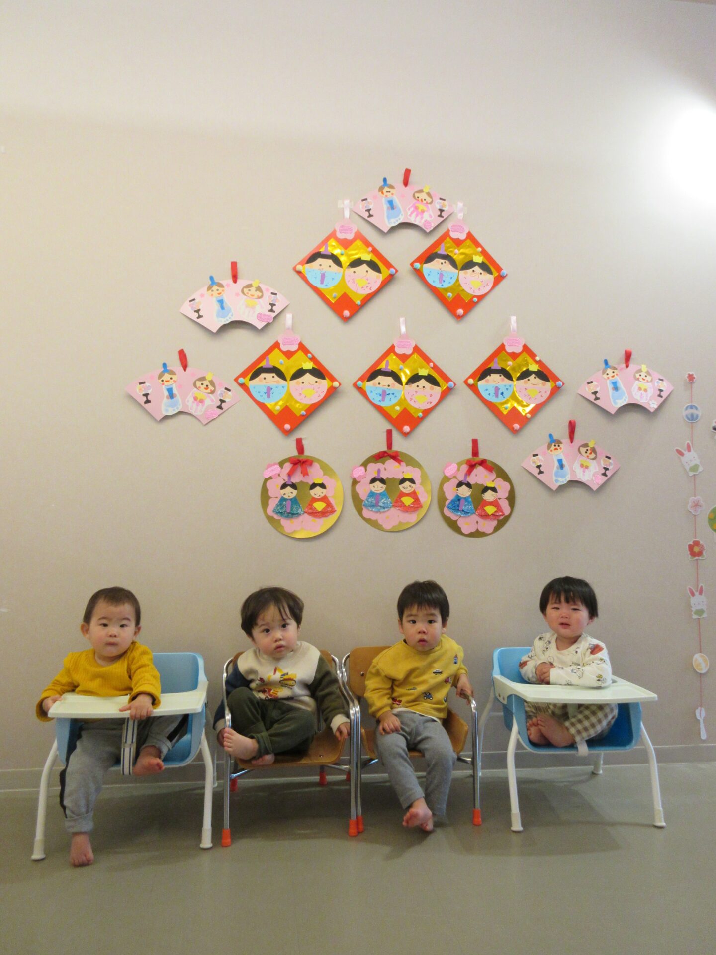 3月3日はひなまつり🎎。今日のひなまつりは、どんなことをするのかな~と楽しみにしていた子どもたち。子どもたちが作ったおひなさまが見守ってくれている中、お楽しみ会の始まり、始まり~💖