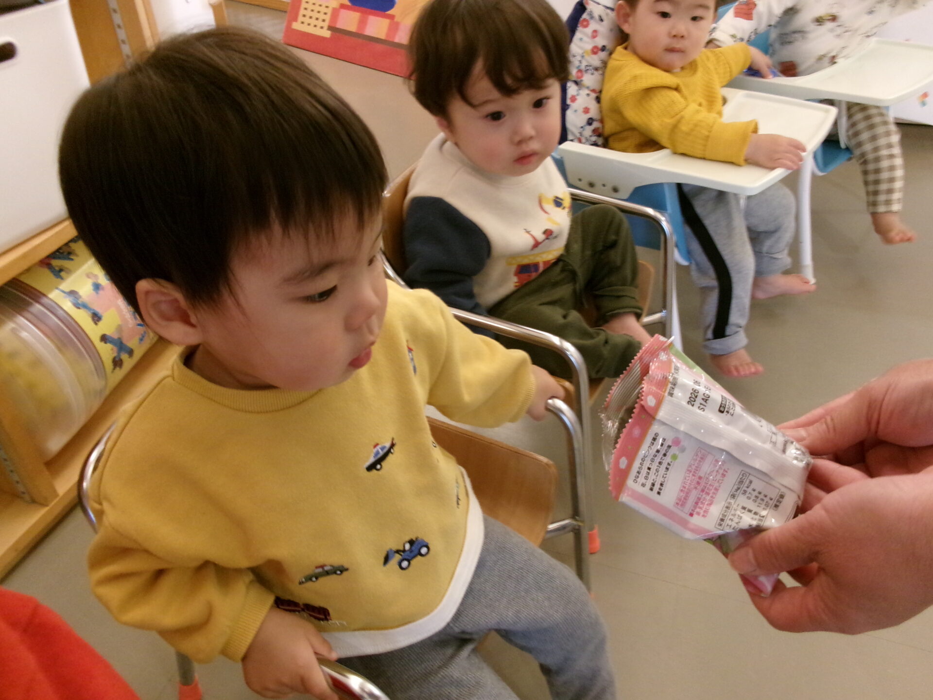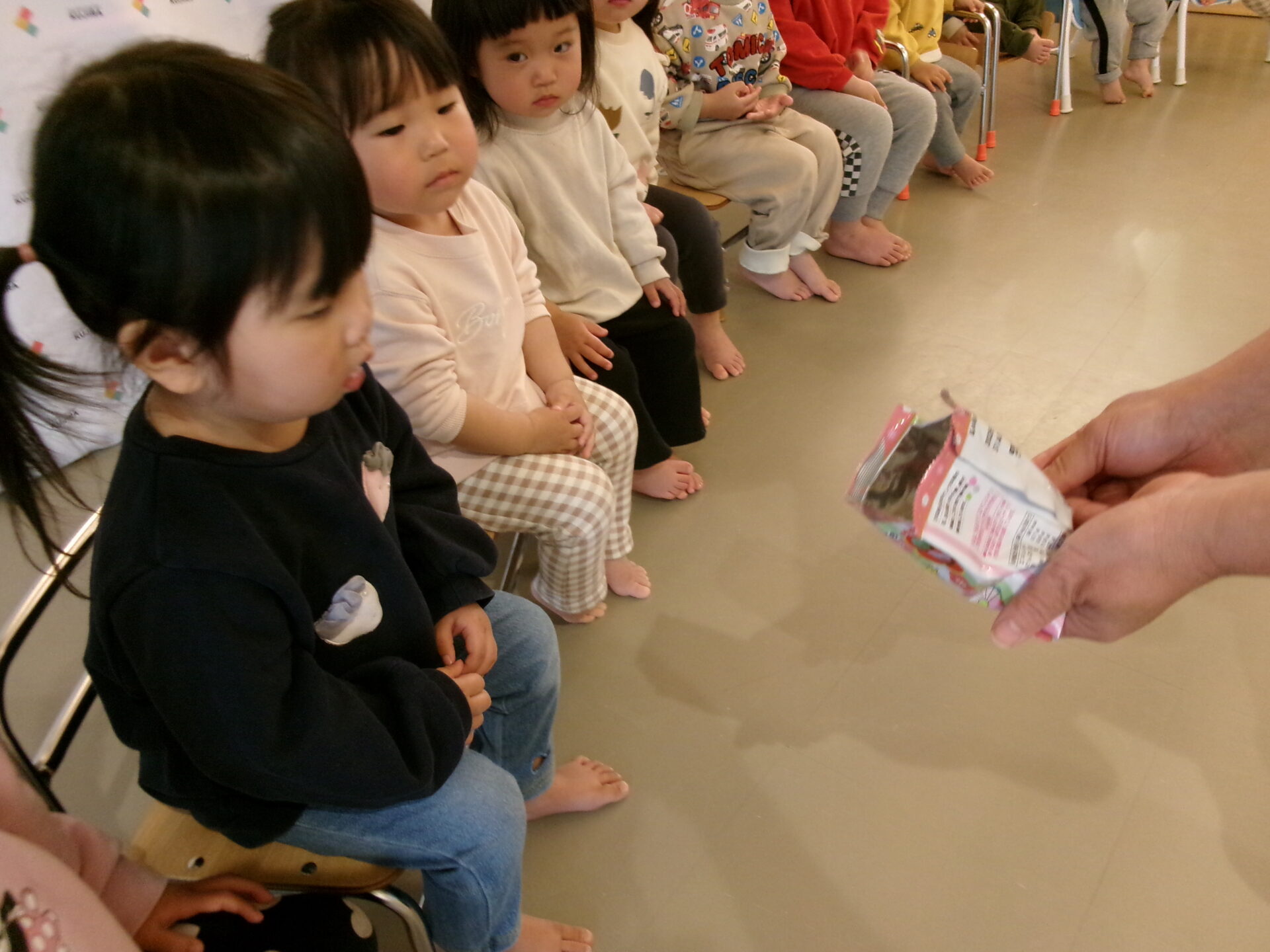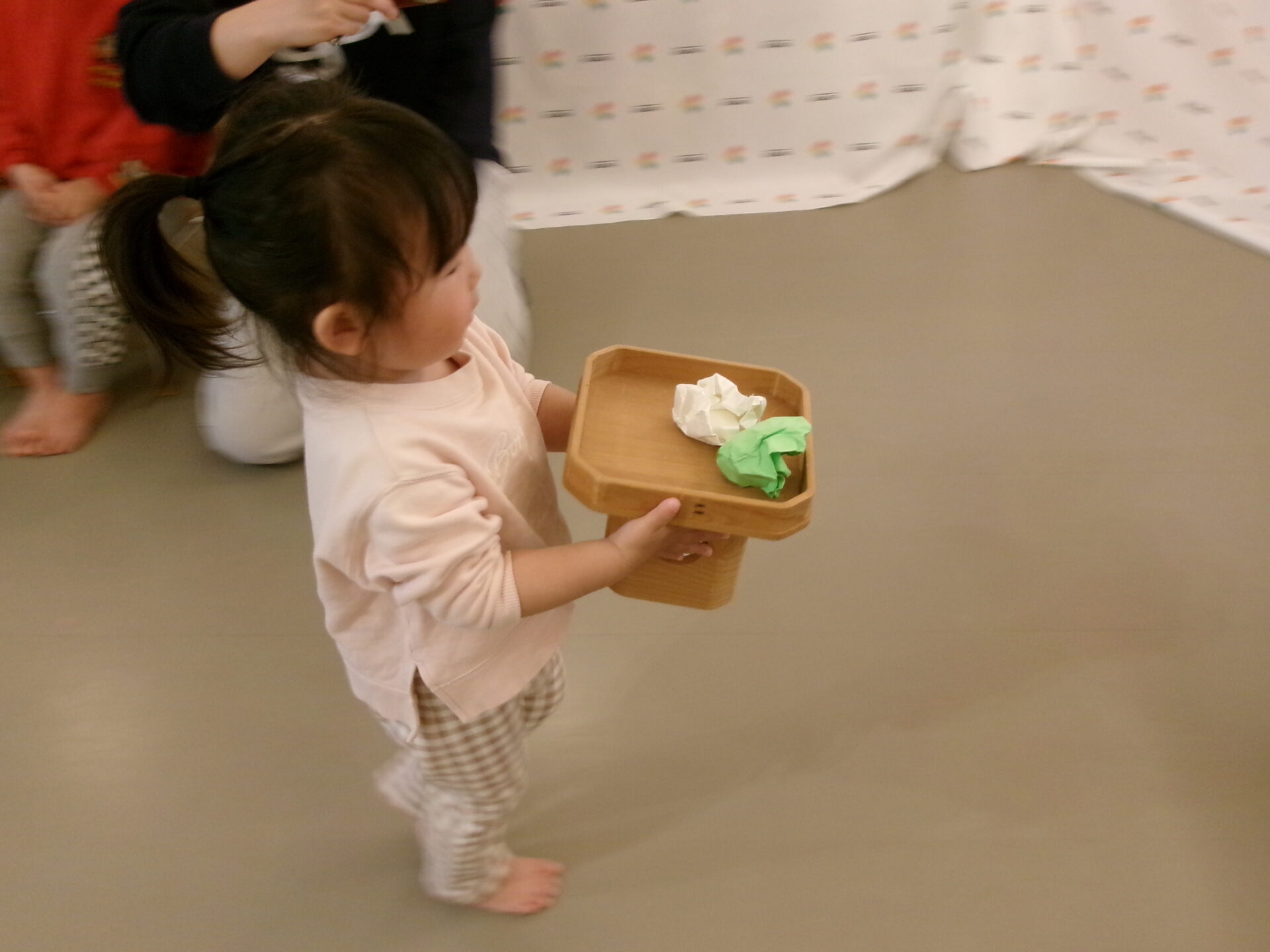 1歳児は、三方にひなあられを入れて、運びました。