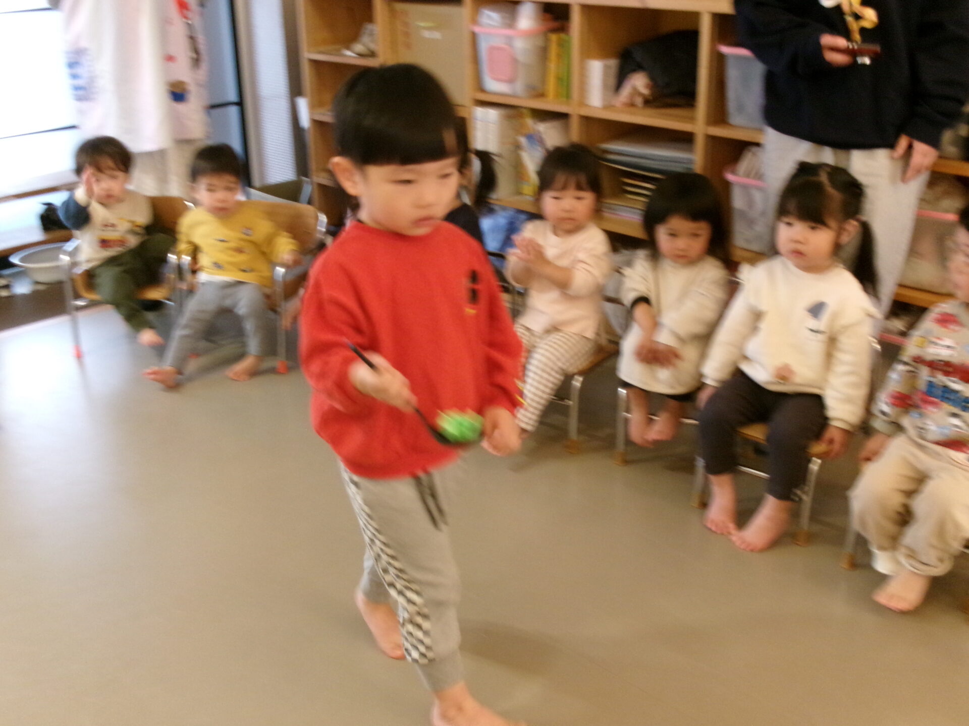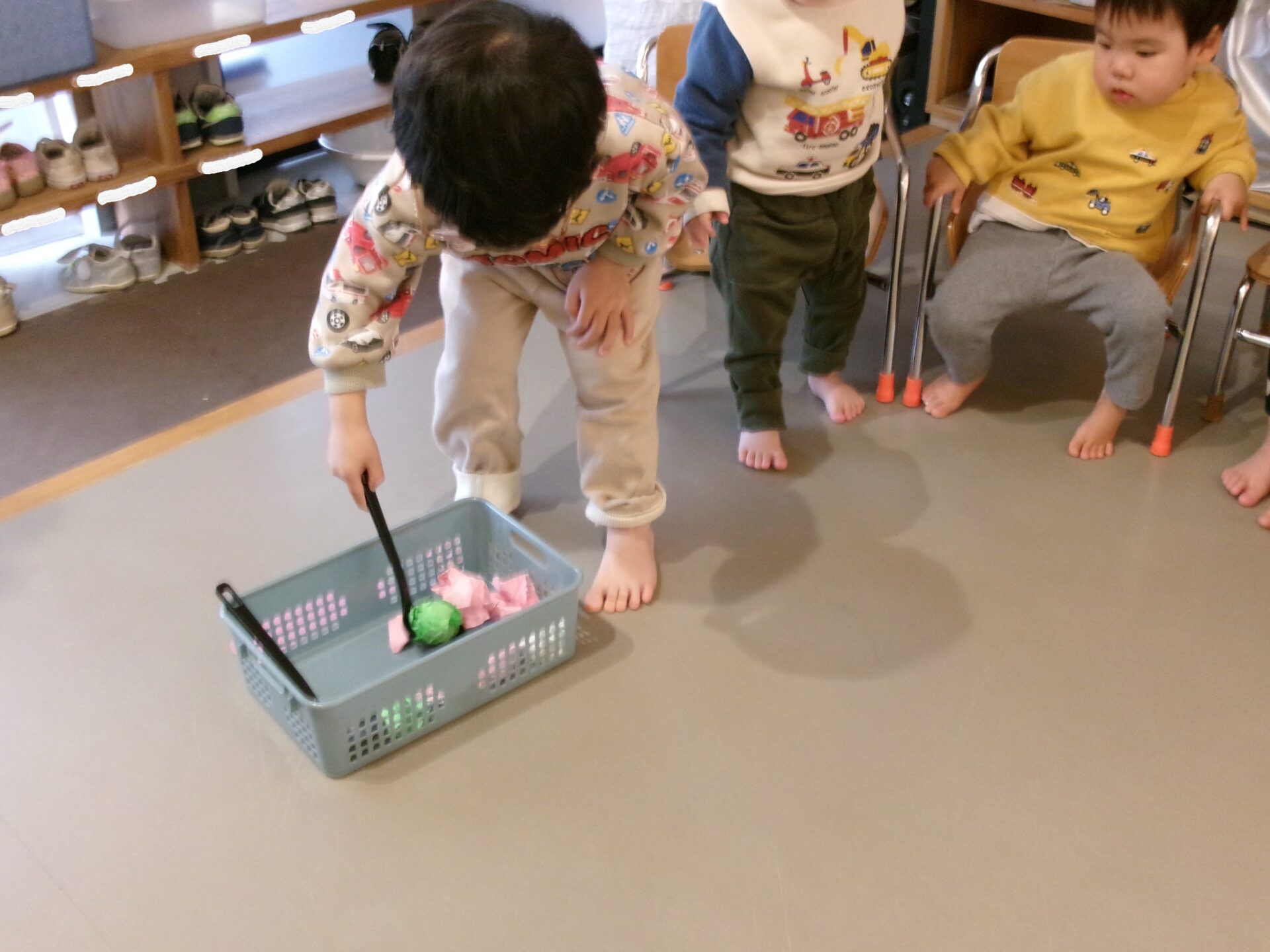 2歳児は、おたまですくって、ひなあられを運びました。