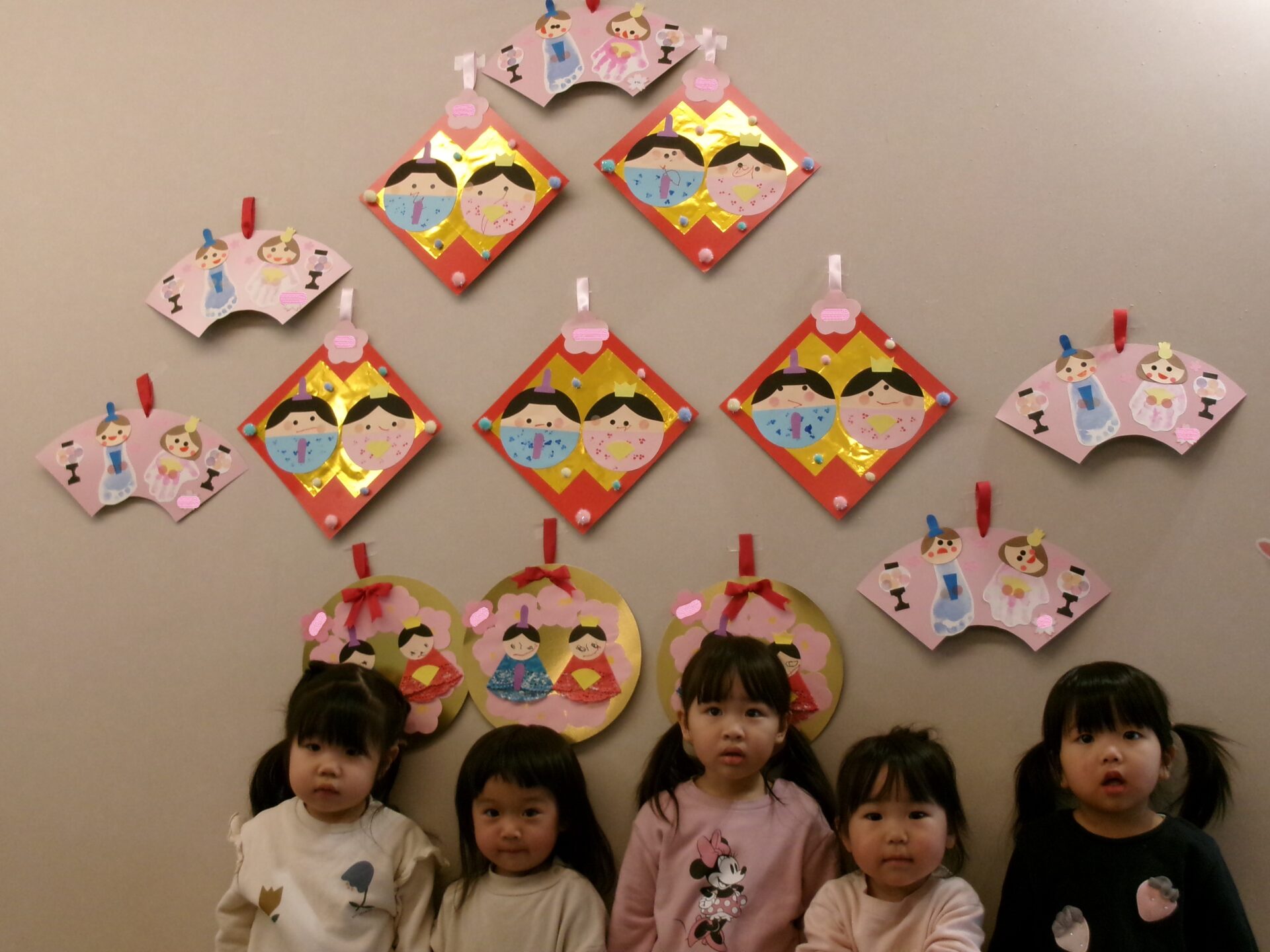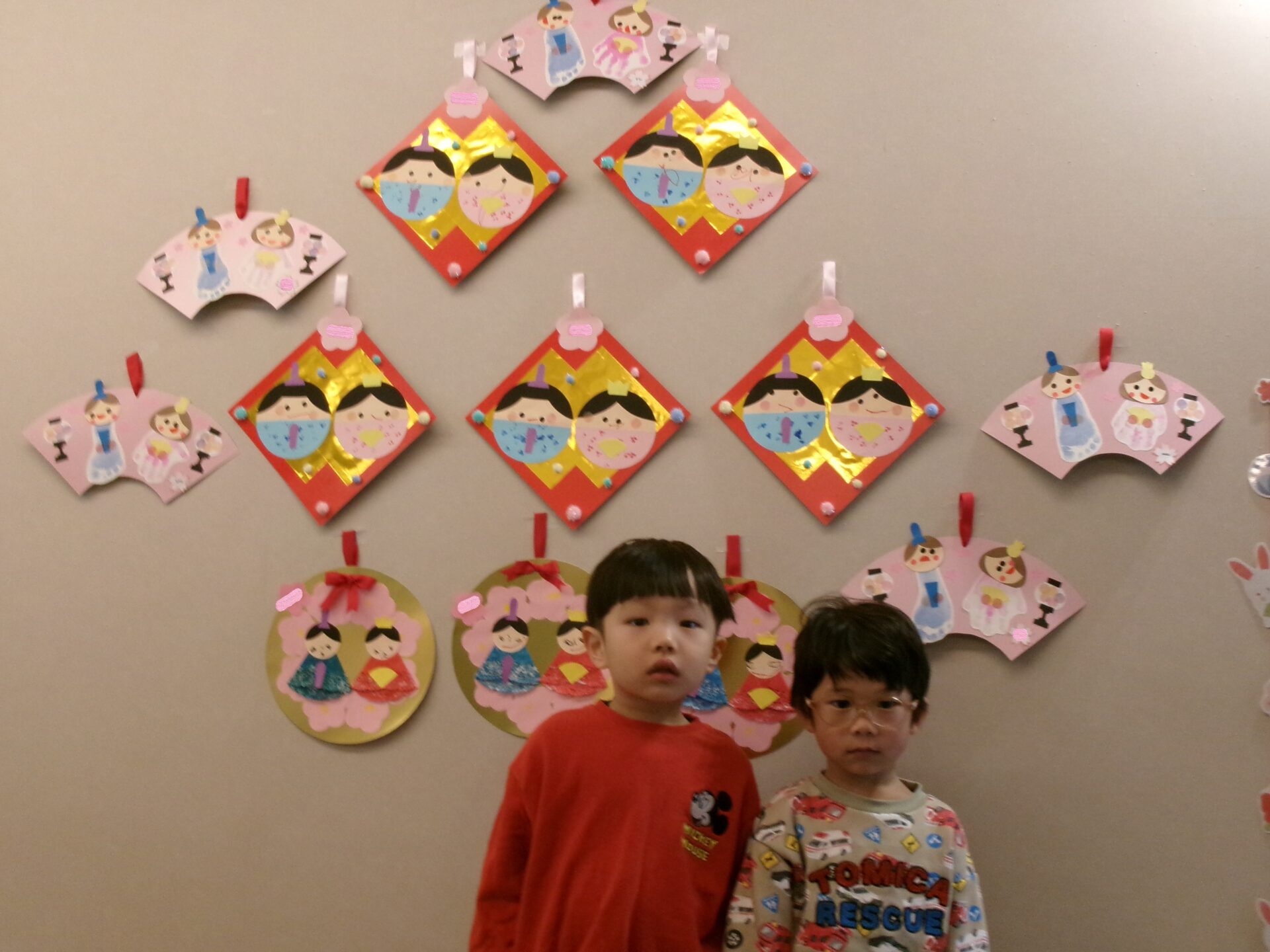 自分たちで作ったおひなさまの前で記念撮影、「はい!ポーズ☆」
