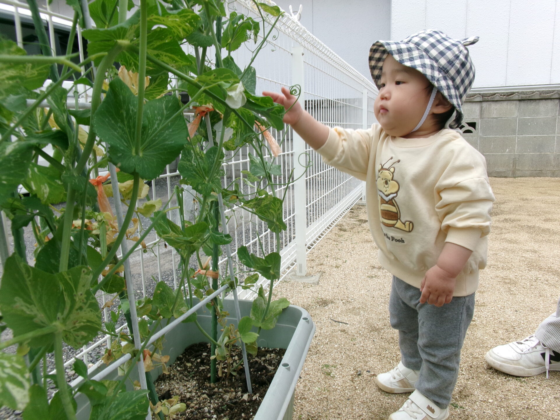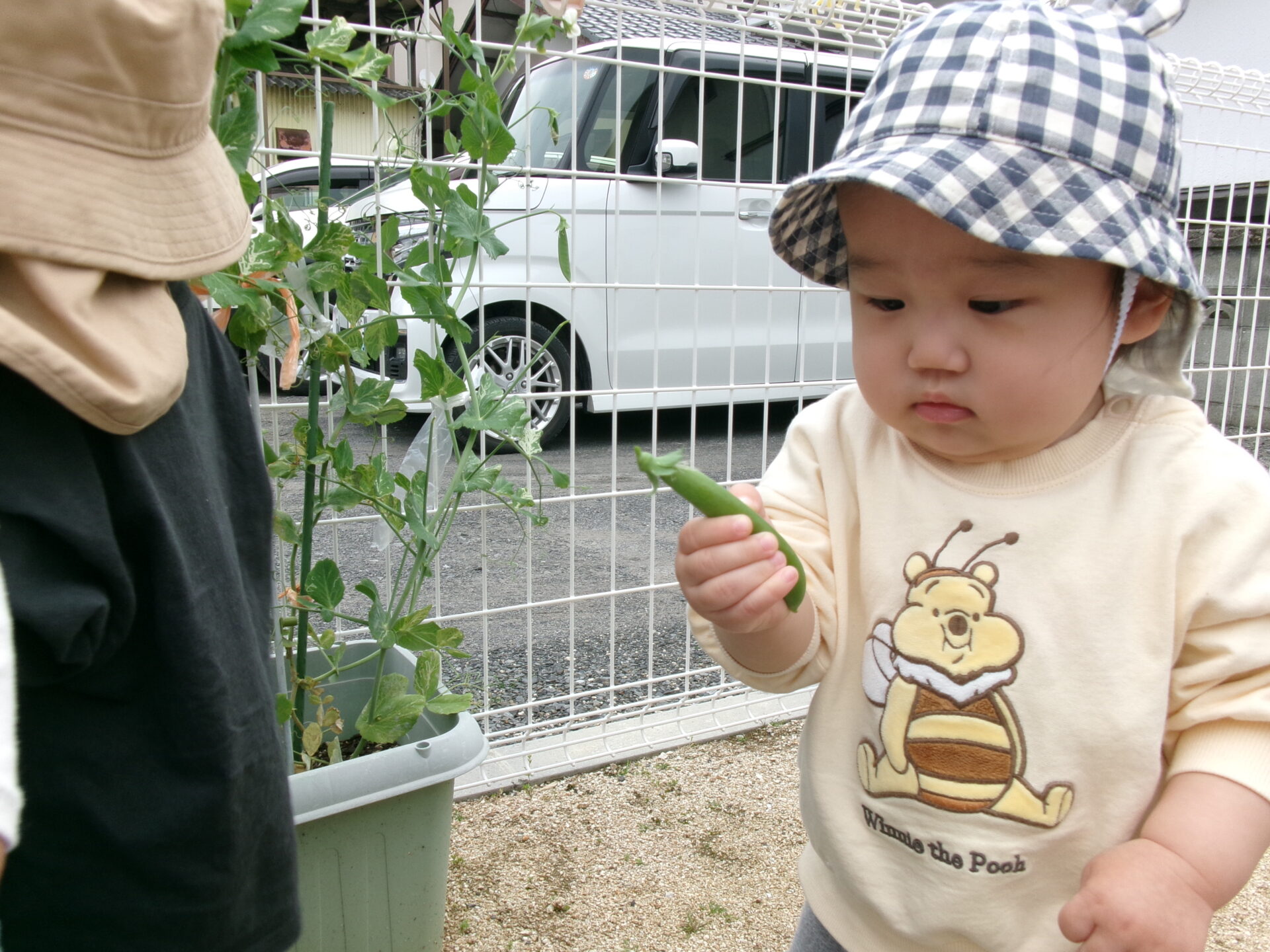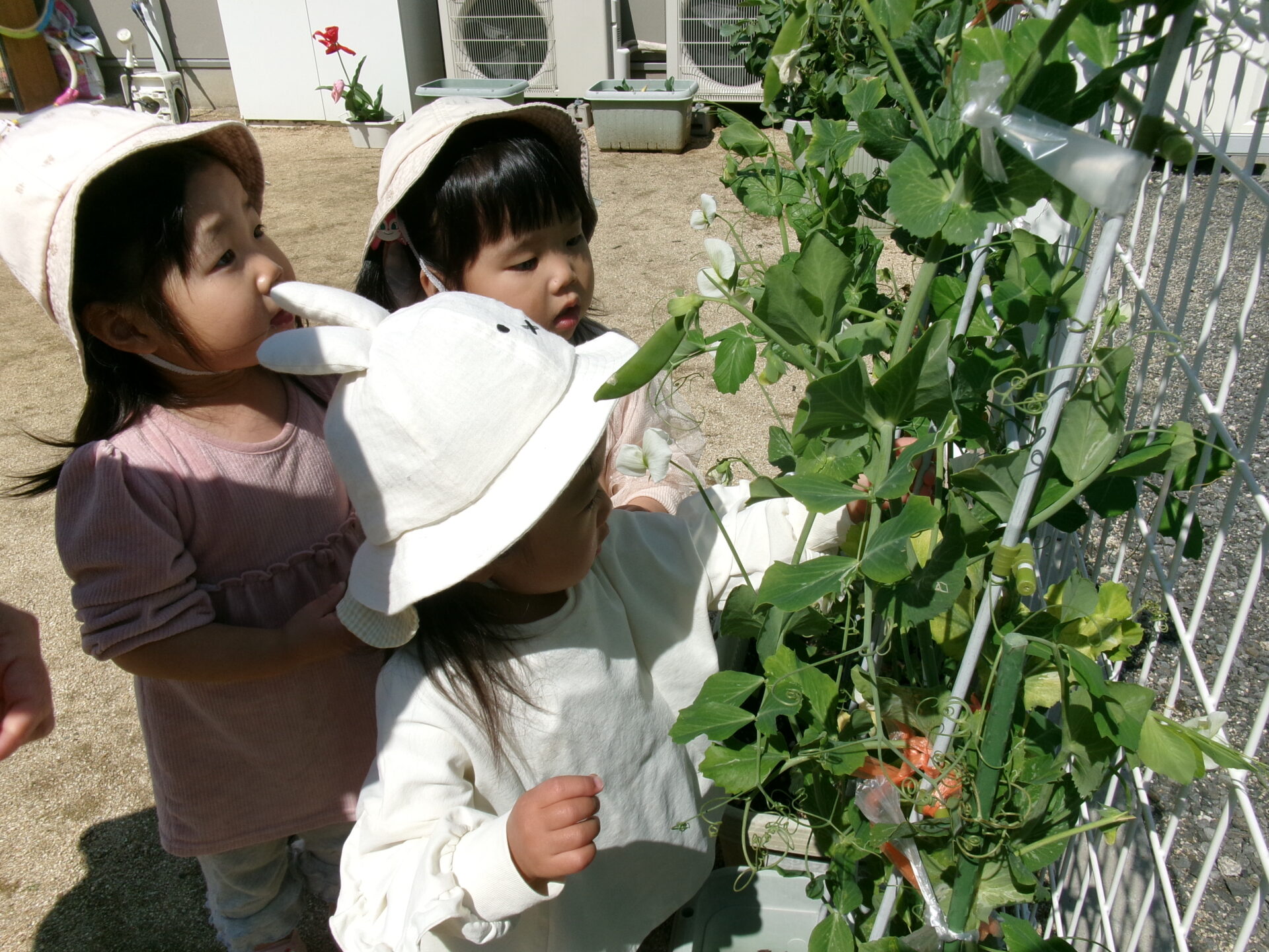 園庭に出ると、スナップエンドウがたくさんできていて、まんぼう組(二歳児)を中心に先生と一緒に収穫しています。
