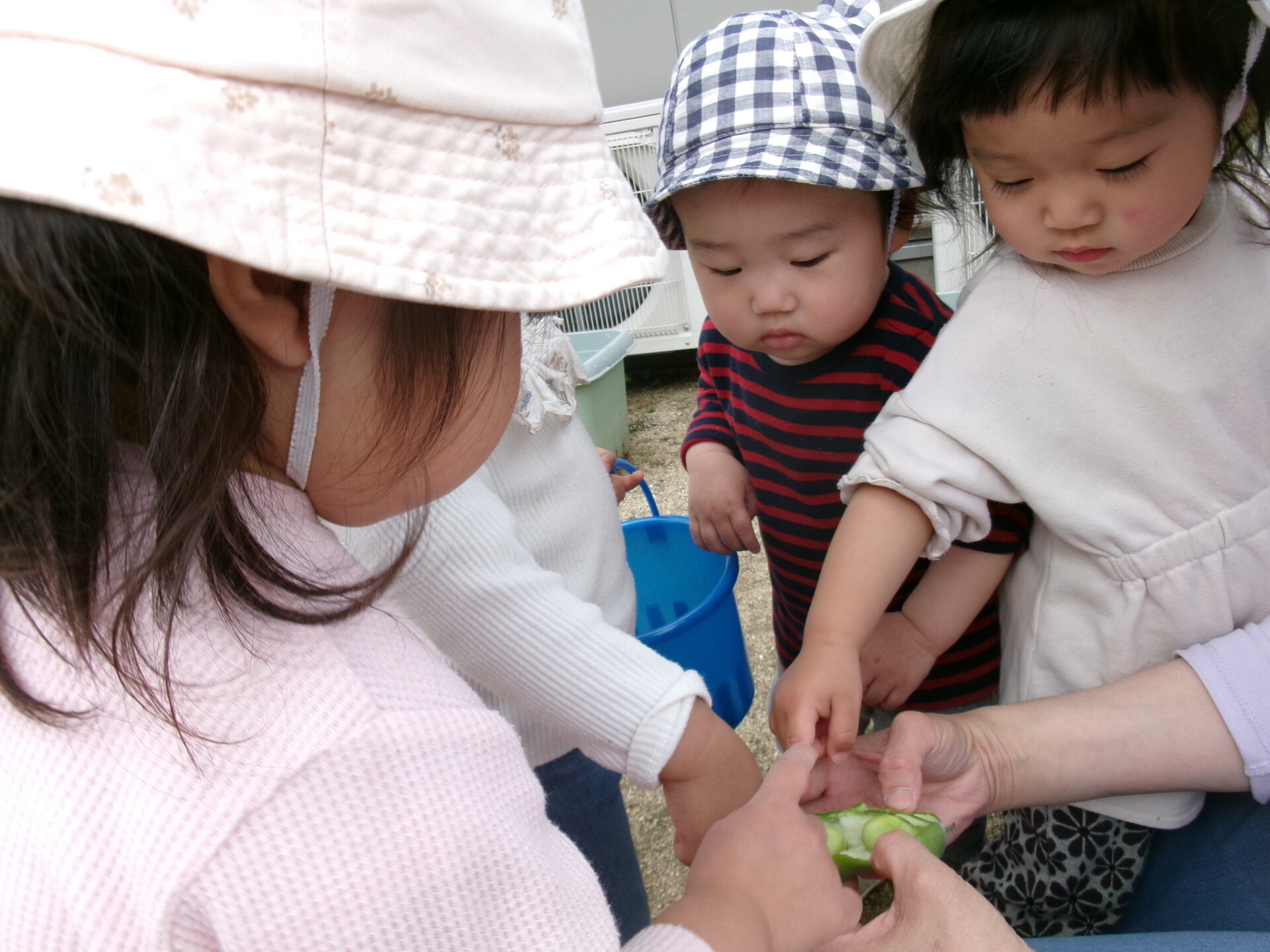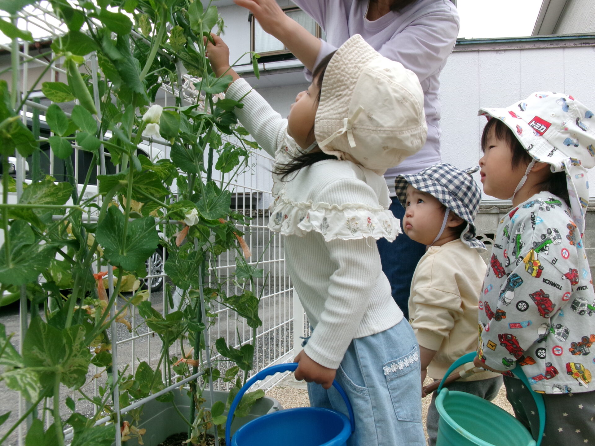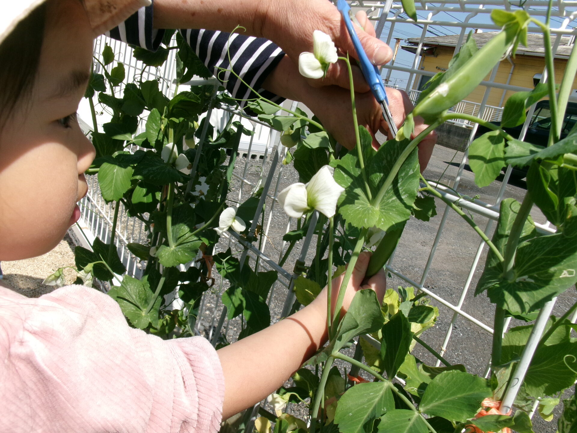 園庭に出ると、スナップエンドウがたくさんできていて、まんぼう組(二歳児)を中心に先生と一緒に収穫しています。