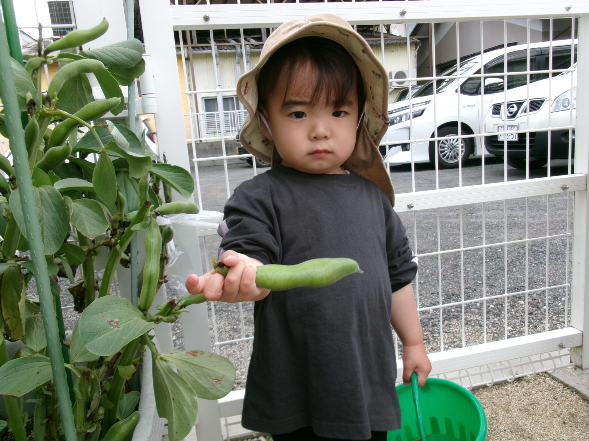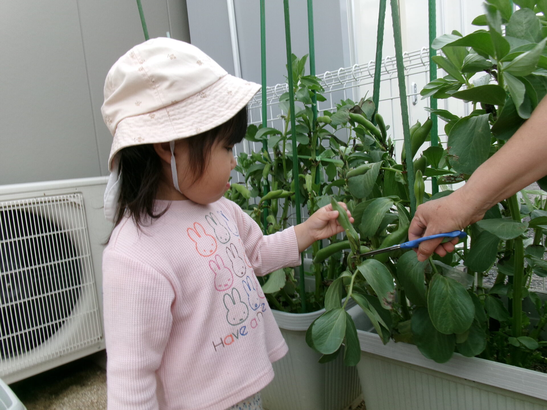 まんぼう小規模保育園では、スナップエンドウやそら豆が実をつけ、収穫時期になってきました。