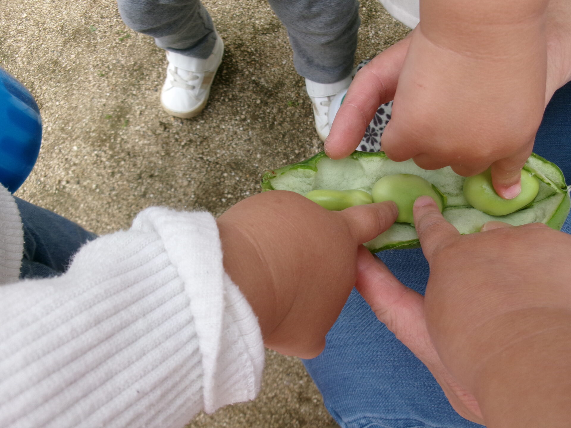 そら豆の収穫では、さやを割って中をのぞいてみました。